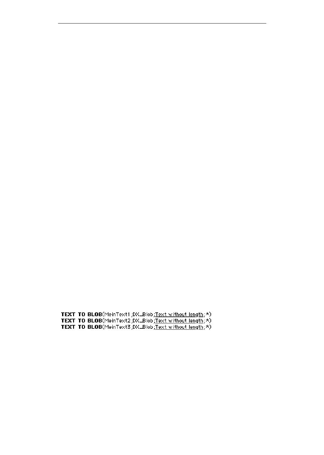 V. DATAform-Datenbank-Schnittstelle 124 Entwicklerhandbuch DATAformXTension © 1992-2004 www.gassenhuber.de Die drei Methoden der eigentlichen Schnittstelle DX_Write DX_Write (Selector; {Pfad}) => Boolean Die Funktion DX_Write dient der Übergabe von Objekten an QuarkXPress. Die Übergabe kann über die Zwischenablage oder eine Datei erfolgen. Beim Import in QuarkXPress ist das DATAformXTension auf einen Import aus der Zwischenablage oder einer Datei einzustellen. (S. unter DATAformXTension „Einstellungen…“.) Die Übergabe von Objekten hat i.d.R. folgenden strukturellen Aufbau: DX_Write (0;{Pfad})  ` die Schnittstelle neu initialisieren Schleife durch die zu exportierenden Datensätze Füllung des DX_Arrays mit den Werten eines Rahmens DX_Write (1) `den gefüllten DX_Array an die Schnittstelle übergeben Nächsten Datensatz laden Schleifenende DX_Write (2) `Alle gesammelten Objekte an QuarkXPress übergeben. Die Prozedur DX_DemoWrite  demonstriert den Vorgang. Die Aufrufe müssen in der Reihenfolge 0, 1, 2 erfolgen. DX_Write liefert True, wenn kein Fehler aufgetreten ist. Die Variable "DX_Error" wird 0. DX_Write liefert False, wenn ein Fehler aufgetreten ist. Die Fehlernummer wird dann in die Variable DX_Error geschrieben. DX_Write (0;{Pfad}) => Boolean Initialisert den TextArray DX_Array. Wird ein Pfad übergeben, wird die Datei erzeugt und geöffnet. Fehlt der Pfad, wird mit der Zwischenablage gearbeitet. DX_Write (1) => Boolean Übergibt den DX_Array (das Objekt) an die Schnittstelle.  Die Schittstelle übersetzt das Objekt in DATAformMarken und legt es in einem Puffer ab. Beginnt eine DX_Array-Zeile mit „*“, wird der Inhalt der Zeile wie er ist, ohne Übersetzung, übergeben, vgl. DX_Read (3). DX_Array{1} und DX_Blob Der Text/Bildpfad des Rahmens wird normalerweise in DX_Array{1} übergeben. Bei verketten Rahmen muß der gesamte Text der Kette mit dem ersten Rahmen übergeben werden. Hier können lange Texte entstehen, die die 30K-Grenze für DX_Array{1} überschrei- ten würden. In diesem Fall übergibt man den gesamten Text an den Blob DX_Blob. Viele Texte werden nach diesem Schema addiert: Am Ende folgt ein DX_Write (1) für den gesamten Text des Rahmens. Pro DX_Write(1) kann zwischen der Übergabe an DX_Array{1} und  DX_Blob gewechselt werden. Enthält der Blob Daten, werden seine Daten und nicht die in DX_Array{1} verwendet. Der Blob wird dann durch DX_Write(1) in die Datei geschrieben und wieder auf Null gesetzt. Arbeitet man mit DX_Blob werden die Daten nicht mehr gesammelt, sondern immer sofort in die Datei geschrieben. Bei kleinen Textmengen und Bildpfaden füllt man besser den DX_Array{1} um den Plattenzugriff zu verringern.