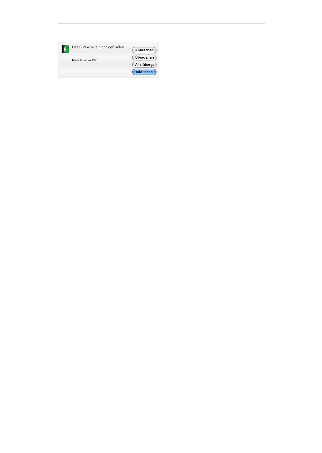 I. DATAformXTension Wird das Bild „Mein falscher Pfad“ nicht gefunden, erscheint der Dialog: Abbrechen Der Bildrahmen wird erzeugt, das Bild wird nicht geladen. Der gesamte Importvorgang wird abgebrochen. Übergehen Der Rahmen wird erzeugt, das Bild wird nicht geladen. Der Vorgang fährt mit dem nächsten Objekt fort. Alle übergehen Klickt man dieses Schaltfeld, so erscheint der Dialog bei diesem Importvorgang nicht mehr. Werden weitere Bilder nicht gefunden, werden zwar ihre Rahmen erzeugt, aber der Bild-Lade- Vorgang wird übersprungen. Bild laden Der QuarkXPress-Bild-laden-Dialog wird geöffnet, und ein Bild kann ausgewählt und plaziert werden. Klickt man in diesem Dialog auf Abbrechen, wird das Bild übergangen, und DATA- form fährt mit dem nächsten Objekt fort. Funktionsobjekte Über Funktionsobjekte kann man Meldungen bei fehlenden Bildern unterdrücken; v.a. beim Arbeiten mit der Nachrichtenschnittstelle kann das wünschenswert sein. Siehe Seite: 93. Bildrahmen importieren Übergibt man einen leeren Bildpfad wird lediglich der Bildrahmen plaziert und nicht nach einem Bild gesucht: ¶*#2*T13*x100*X200*y100*Y150*$¶ Erzeugt einen leeren Bildrahmen, vgl. {1} *$ Text/Pfad, Seite: 32. Positionierung, Musterseiten Die importierten Objekte werden entweder auf der gerade aktuellen Seite des QuarkXPress- Dokuments plaziert oder auf der Seite, die durch die Marke {6} *p Seite festgelegt wurde. (S. die Beschreibung bei *p, Seite: 38) Auf Musterseiten können keine Objekte plaziert werden. Musterseiten können aber für neue Seiten herangezogen werden. (S. unter {3} *P Musterseite, Seite: 35) 16 Entwicklerhandbuch DATAformXTension © 1992-2004 www.gassenhuber.de