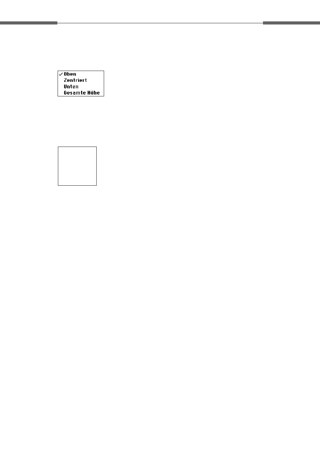 II. DATAformMarken Entwicklerhandbuch DATAformXTension © 1992-2004 www.gassenhuber.de 46 {23} *D Vertikale Ausrichtung [0…3] Die Marke definiert die vertikale Ausrichtung des Textes in einem Textrahmen. Der Quark- XPress-Textrahmendialog bietet hierfür ein Klappmenü mit vier Möglichkeiten: *D0 Oben *D1 Zentriert *D2 Unten *D3 Gesamte Höhe ¶*T3*D1*$vertikal zentrierter Text¶ erzeugt einen Textrahmen mit zentriertem Text. vertikal zen- trierter Text
