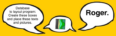 The database marks any box placed in QuarkXPress or InDesign with a specific, invisible number. Thus each box and each picture can be called by the database. It can be updated or re-imported into the database.