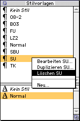 Es gibt jedoch hierfür einen einfachen und komfortablen Umweg: Öffnen Sie die Stilvorlagenpalette und machen Sie einen Ctrl-Klick/rechten Mausklick auf die zu löschende Stilvorlage. Im folgenden Klappmenü wählen Sie dann Löschen: